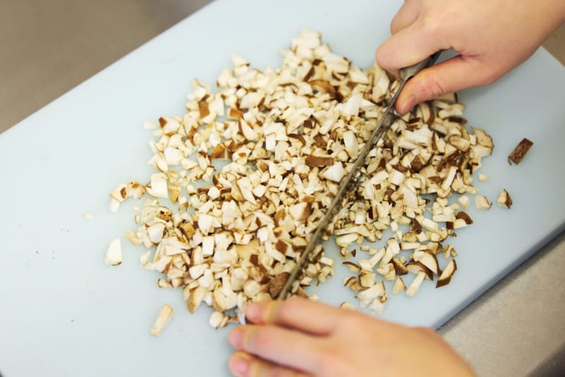 タネ作りから。長ネギときのこと生姜は粗みじん切りにし、片栗粉をまぶしておく。