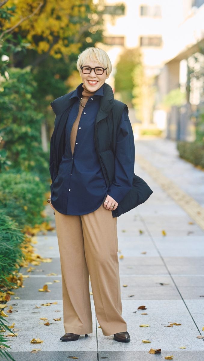 中綿ベストはアウトドア感があって、大人世代にはむずかしく感じるアイテムですが、ベストの下にシャツに重ね着をして、インにはトラッド感のあるキャメルを合わせることで、ほどよいカジュアルミックスになります。