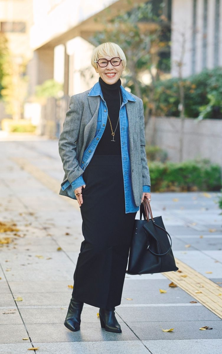 ジャケット、ダンガリーシャツ/ともにユニクロ、タートルニット(メンズサイズ)/無印良品、スカート/GU、ブーツ/ザラ、バッグ/メゾンマルジェラ