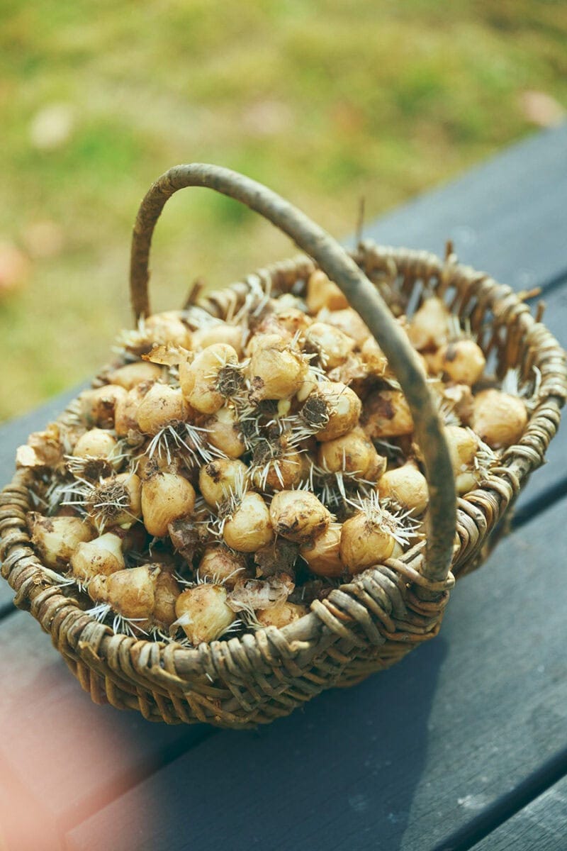 カゴの中には「今日、このあと植える予定なんです」というムスカリの球根が200個ほど。春先にブドウのような形状の青い花を咲かせる。