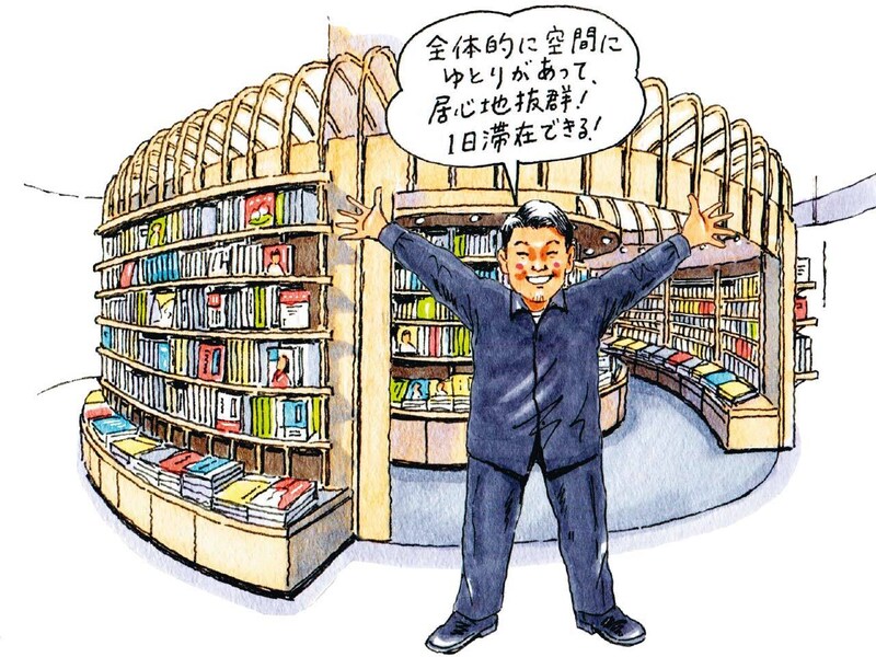 通路が広く、約10万冊そろう本のレイアウトもゆったり。カフェラウンジやMTGルームが設けられ、仕事もできる。