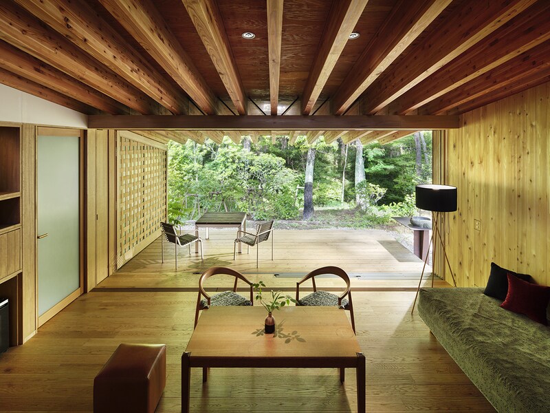 35,000㎡を超える施設の見どころは、建築家の石上純也さんが318本の樹木と大小160の池を緻密に配した「水庭」だ。計算された自然をコンセプトに、ヴィラも自然の延長のように木材を中心に造り、テラスの外には木々が茂る。