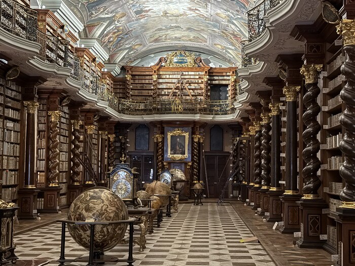 天井いっぱいに描かれたフレスコ画、重厚な木製の書架、年代を感じさせる地球儀。どこを切り取っても装飾的だが、空間全体には静けさが漂っていた。観光名所でありながら、声をひそめたくなるような空気感が印象的だった。