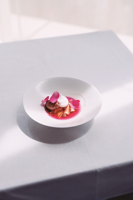 2皿と2杯でのコース仕立てとなるデセールは、「昆布屋孫兵衛」からは「カカオハンターズ」のホワイトチョコ、カカオパルプ、ココナッツ、バナナを使って酸味や香りを楽しむアシェットデセール、「ミネコ カトウ」からはライムとローズのクリームやカカオを使ったゼリーなどに「プレスキル ショコラトリー」のチョコレート「ベニ・ワイルド」を使ったアイスを添えたひと皿。