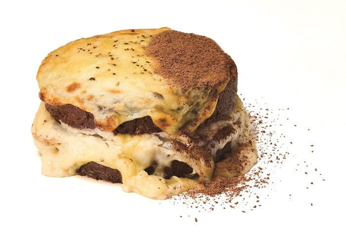 「ピエール・エルメ イクスピアリ サロンドテ」のスーシェフや「パティスリー カメリア 銀座」のオープニングシェフなど華やかな経歴をもつ「タイスケ エンドウ」のクロックムッシュは、トロッととろけるビジュアルが魅力的。ショコラが香るブリオッシュ生地に、ベシャメルソースやハム、コンテチーズをサンドして焼き上げた、斬新ながらもクセになる味わい。