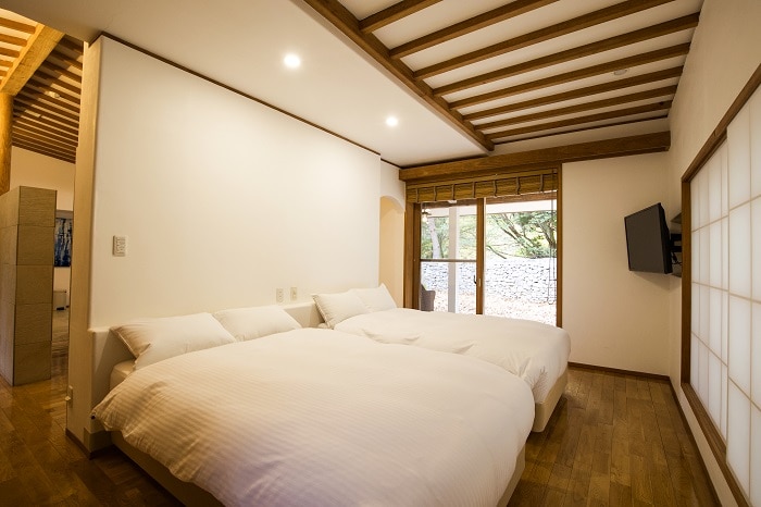 全室掛け流し温泉付き。人と犬、どちらも快適な空間設計