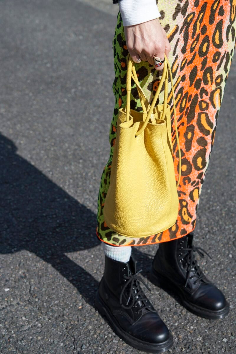 バケツ型のレザーバッグは、藍田さん行きつけの「シスターマーケット」と「ハブファン」のコラボレーション。華やかなスカートの柄のイエローとリンクさせて、着こなしのアクセントに。