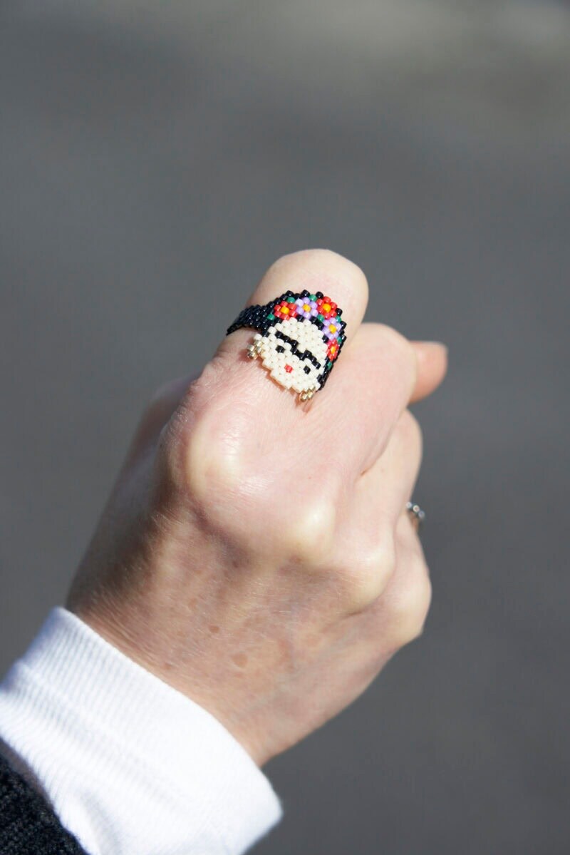 逗子(神奈川県)のメインストリートにあるテキーラバー「エルアグーハ」には、ウイットに富んだ雑貨やアクセサリーが並んでいます。「メキシコの女の子をモチーフにしたこのリングは、表情が可愛くて、即買い」と藍田さん。