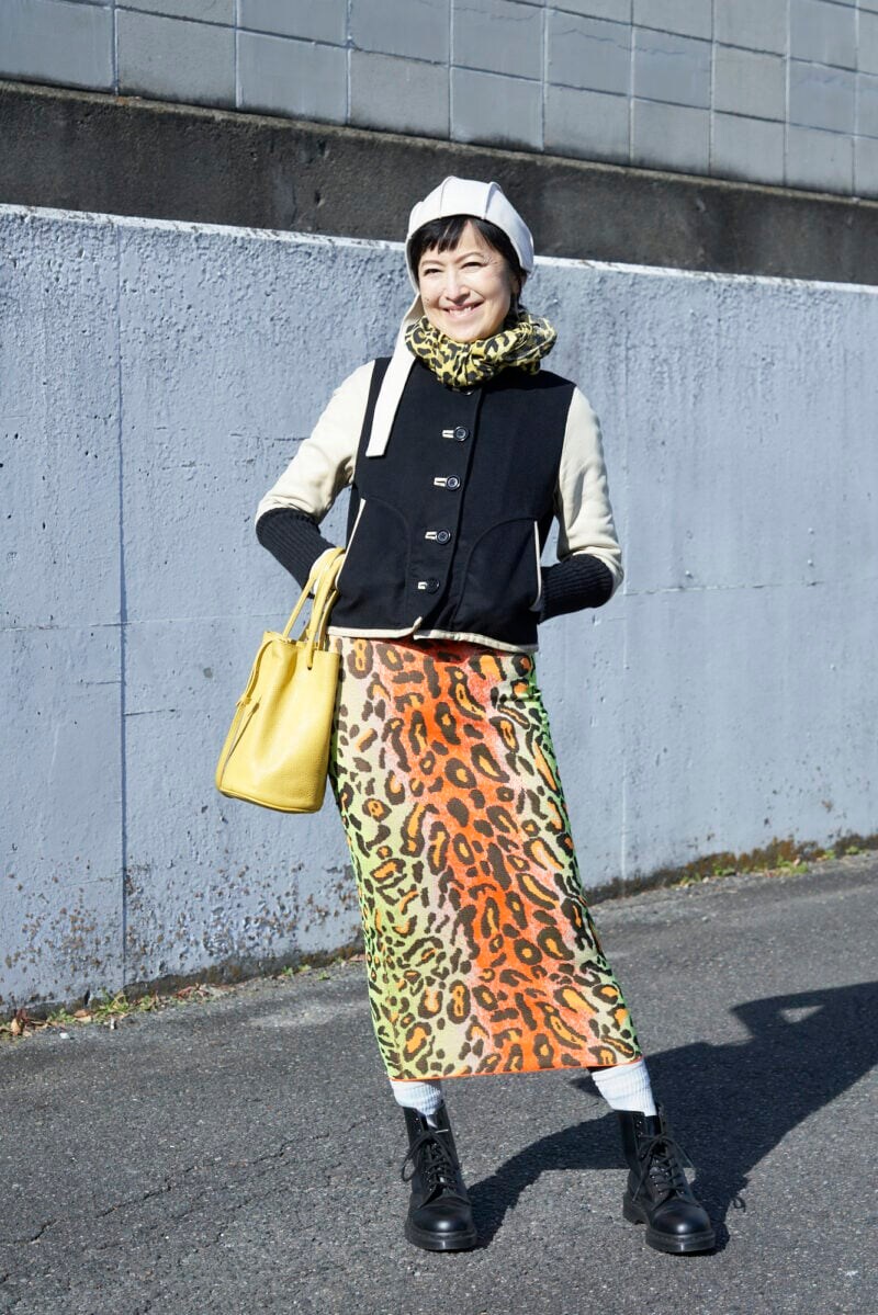 パッと目を惹くレオパード柄のスカートは、ステラマッカートニーのもの。「ご近所のセカンドハンドの店でひとめ惚れ。ウエストはゴムになっていて長時間はいていてもラクちんです」と藍田さん。アウターにオーバーサイズの古着のモヘアカーデを合わせると、ふんわりとやさしい雰囲気をまといます。