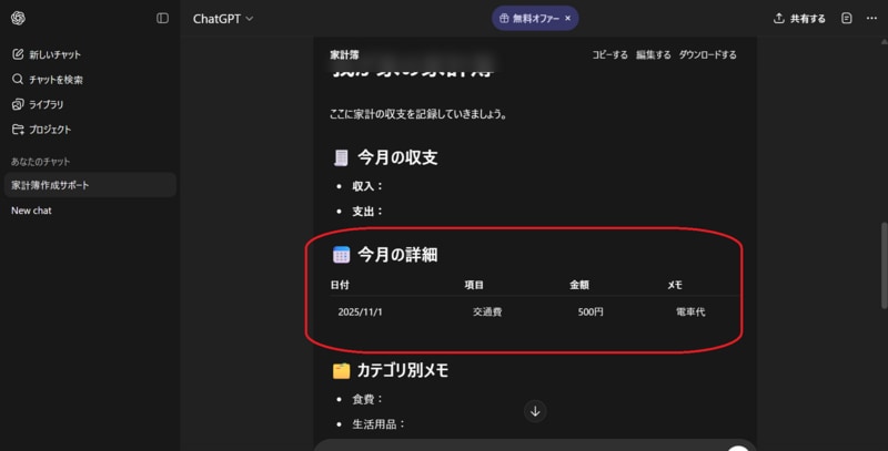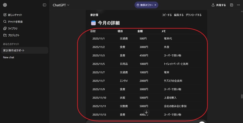 家計簿の作成も可能であり「食費にいくら使った」「交通費がいくらかかった」とAIに伝えるだけでAIがすぐに家計簿を作ってくれます。なおChatGPTは無料版と有料版がありますが、無料版でも家計簿の作成は可能です。