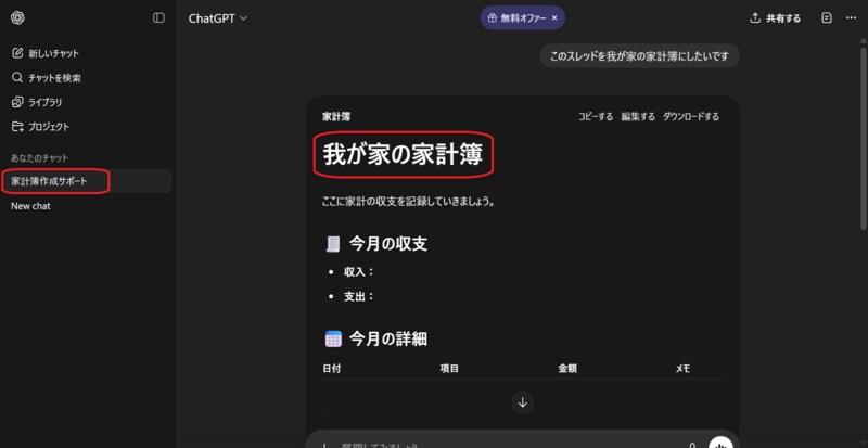 そうすると家計簿専用のスレッドが自動作成されます。以下の画像上ではスレッド名は「家計簿作成サポート」、タイトルは「我が家の家計簿」と生成されましたが、この名称は自動作成されるため都度ランダムに変わります。またこれらの名称は後で自分の好きな名前に変更することも可能です。