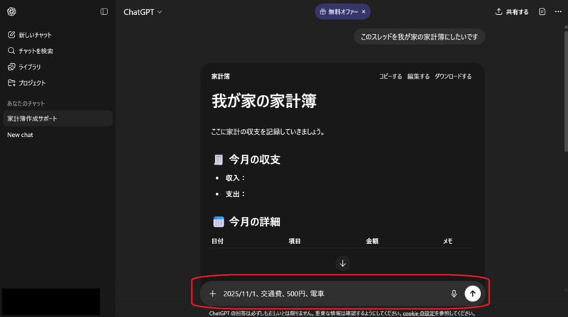 レシートなどを見ながら家計簿として付けるデータを入力します。「日付, カテゴリ, 金額, メモ」を1セットとして入力するとChatGPTのAIが判断しやすくなります。例として「2025/11/1, 交通費, 500円, 電車」のようなイメージです。