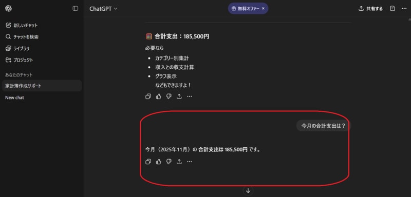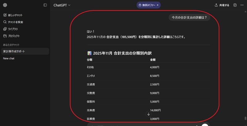 「今月の合計支出の詳細は?」「カテゴリー別に集計して」「円グラフ化して」といった聞き方をすれば、より詳細な支出情報を様々な形式で表示してくれます。