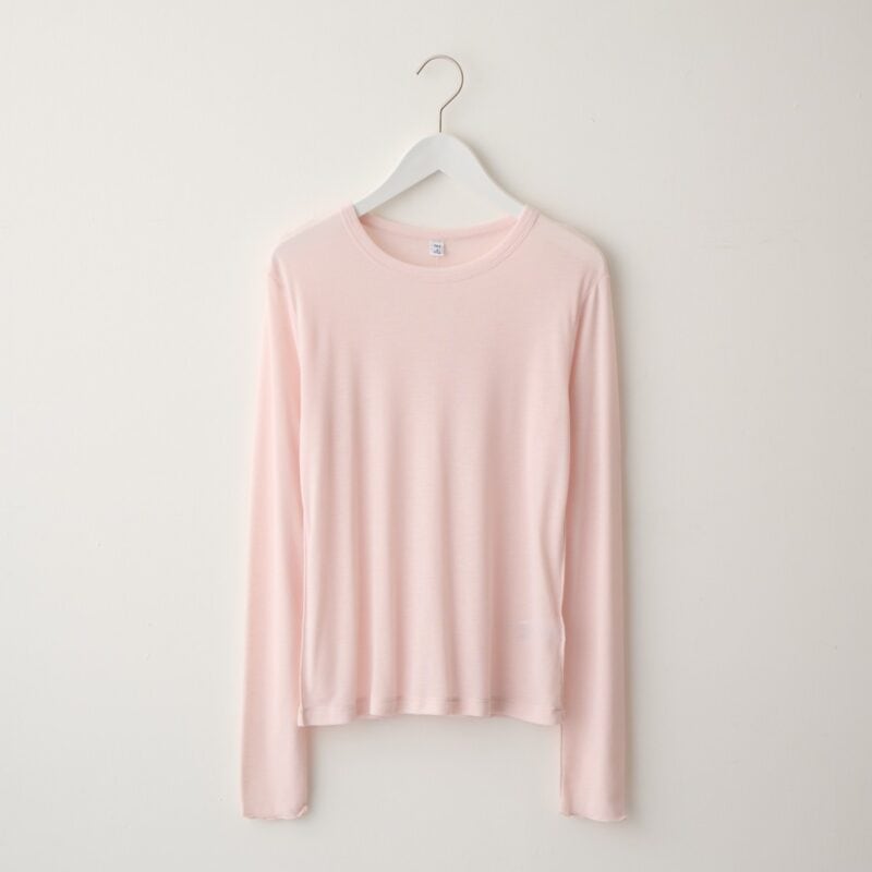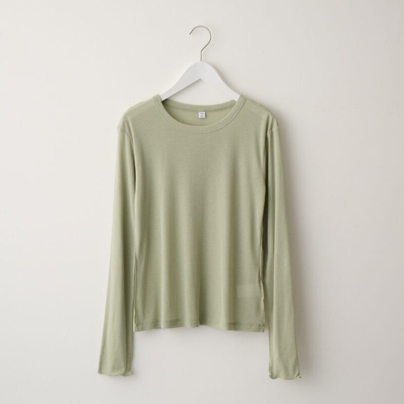 「上品な透け感があって、ふんわり軽い長袖Tシャツ。縫い目はロックミシンでかがるメロー加工がされていて、デザインとしても効いているうえ、肌触りもやさしい仕上がりになっています。重ね着スタイルに便利なポイントもたくさん。まずは、充実のカラー展開。ナチュラル、グレー、ブラックなどのベーシックカラーは持っていると何かと重宝しますが、注目は新色のグリーンのほか、ライトブルー、ピンクなどのペールトーンのもの。春の装いの挿し色として、便利に使えます。ほどよく詰まった首元もポイント。絶妙な分量をのぞかせられます」