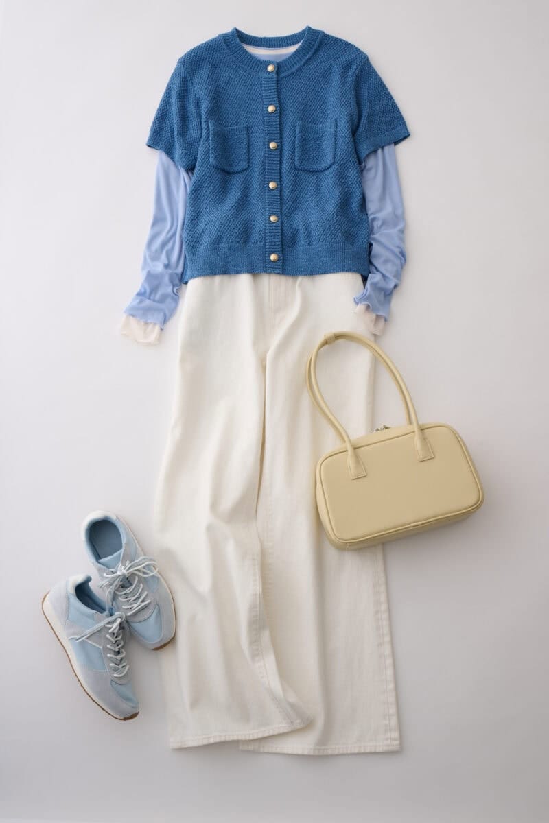 この春のトレンドカラー、ライトブルーを使ったきれいめカジュアルスタイル。ナチュラルカラーを重ね着。襟元と袖口からチラリとのぞかせてぬけ感を演出。ボトムも白を選んで色をリンクさせて。ショート丈のカーディガンはTシャツより少し濃いブルーを選ぶとコーディネートが締まります。