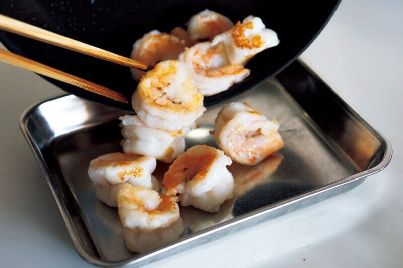 2. フライパンに大さじ1のサラダ油を中火で熱し、えびを並べ