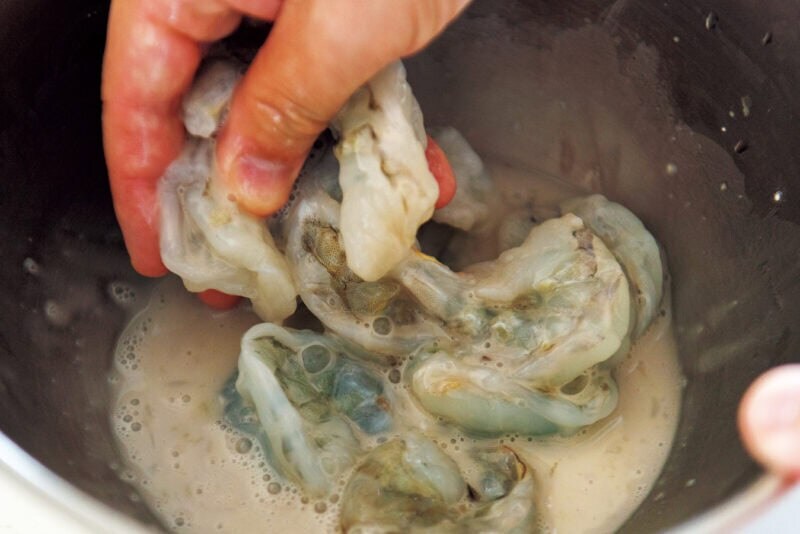 片栗粉と塩、水でえびを洗うことで、えびの汚れが片栗粉に吸着。