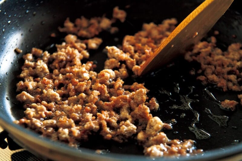 ひき肉から出る油が透明になり、しっかり焼き色がつくまで炒めます。