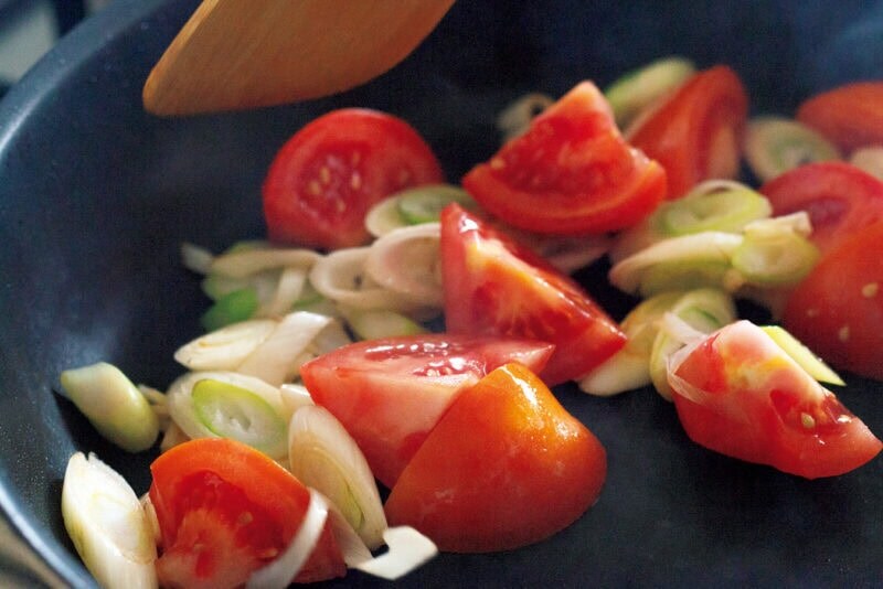 3. 残りのサラダ油を入れて火を強め、長ねぎを入れて炒め、香りが立ったらトマトを加えて1 分ほど炒める。