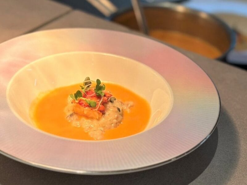 おいしい香りに誘われて私が真っ先に向かったのは、シェフが目の前で料理を作り上げるライブキッチンスペース。この日は、「オマール海老とマッシュルームのリゾット」「ポークバックリブのグリル、猪ソーセージ、レモンポテト」「野菜のグリル」の3品がラインナップ。味覚だけでなく、視覚や嗅覚まで楽しいビュッフェの目玉です。