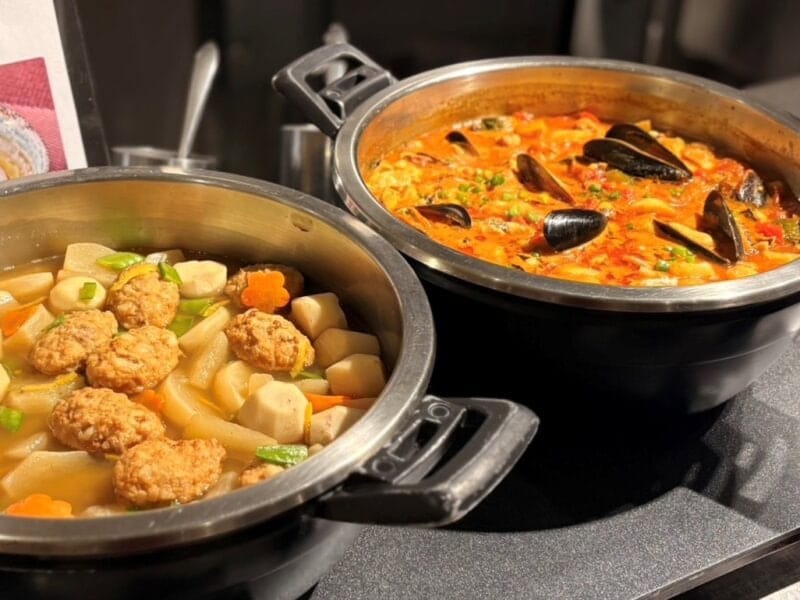 ホタテを使った濃厚なクリームパスタをはじめ、つくねとかぶの煮物、サルスエラ(スペイン発祥の魚介の煮込み料理)など、メイン料理の種類も豊富。気になる料理がありすぎて、迷ってしまいます……! そんな贅沢な悩みを抱えながら少しずつお皿に盛って、結局ほとんどのメニューをいただきました。