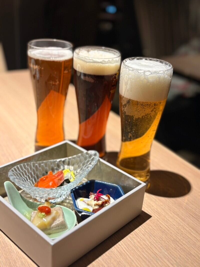 もっぱらビール党の私はひとまず、国際的な審査会で世界最高賞を獲得した鎌倉ビールと、一番搾りとスプリングバレーの3種類を飲み比べ。塩味の強い「セミドライセサミのチーズソース」、食感が楽しい「蒸しアワビとごま豆腐」、うまみたっぷりの「富士サーモントラウトの昆布〆」、小鉢3点セットをお酒のあてにして、晩酌タイムを満喫しました。