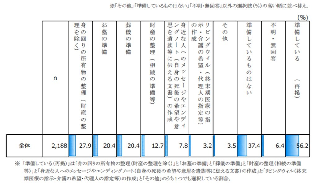参考までに、内閣府「令和6年度高齢社会対策総合調査(高齢者の経済生活に関する調査)の結果」によると、60歳以上の男女の「終活」に係る項目は[図表]のとおりです。