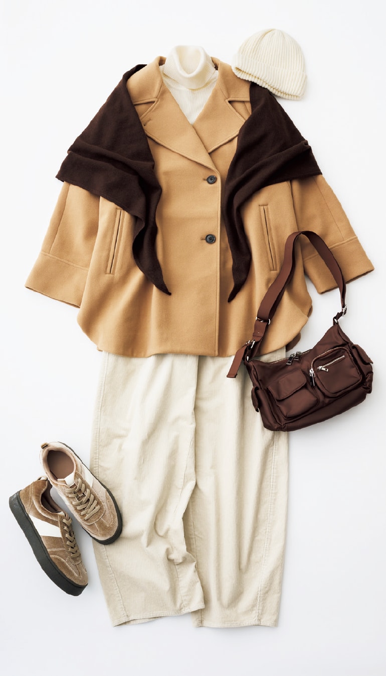 リブタートルネックセーター(一部店舗のみ販売)¥1,990、コーデュロイパンツ¥2,990、三角ストール(一部店舗のみ販売)¥1,990、ニットキャップ¥1,290、ショルダーバッグ(一部店舗のみ販売)¥2,990、スニーカー¥2,990/すべてジーユー