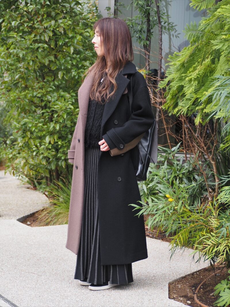 ブラウンと黒のバイカラーが印象的な「ユナイテッド トウキョウ」のコートが冬の定番。「配色使いに個性があったり、一枚でサマになるアイテムに惹かれます」。直線的なラインですっきり見えるコートと動きのあるプリーツスカートが、女性らしさときちんと感を両立。