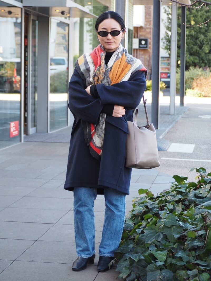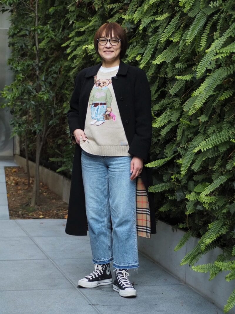 10年ほど前に購入した「バーバリー」のコートは直線的なシルエットで全身を引き締める効果も。流行に左右されないベーシックな黒コートに、遊び心のあるニットとデニムを合わせることで、大人のカジュアルスタイルが完成。絶妙な抜け感が◎。