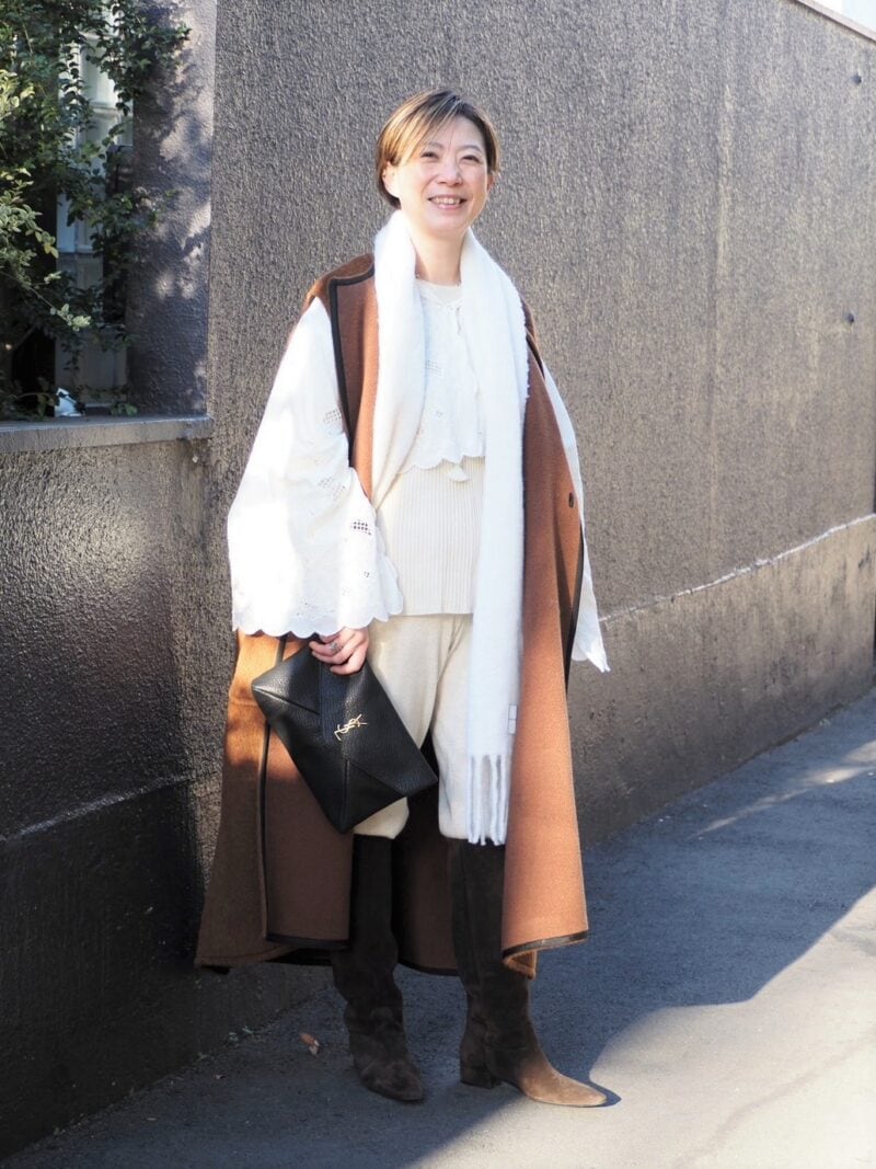 「甘くなりすぎるのは嫌、でも女性らしさを適度に取り入れたい」と話す松本さん。柔らかな白を軸に、ブラウンを効かせた配色センスがお見事。レースやロングジレなど表情のあるアイテムを重ね、ボトムは同系色のニットパンツをセレクト。「はき心地がよくてとにかく楽ちんな『ユニクロ』のリブパンツをブーツインしてみました」