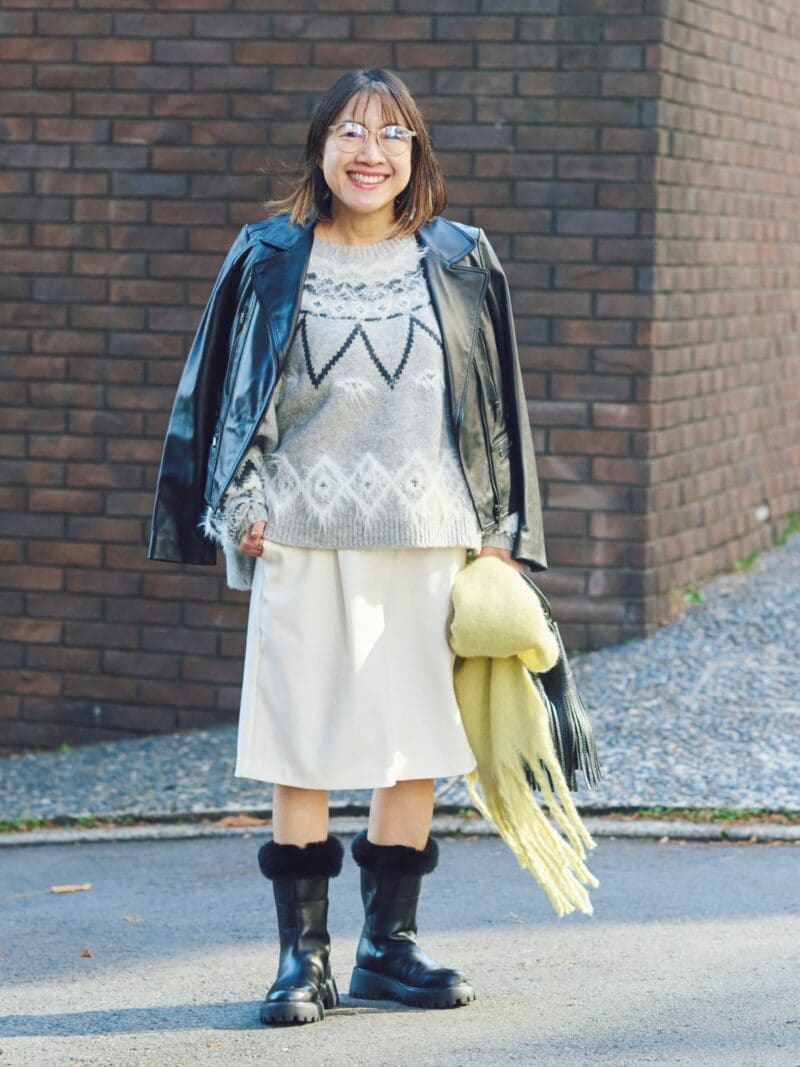 やわらかい雰囲気のノルディックニットは冬の定番。これひとつで温かみのある装いに。ライダースジャケットやレザーブーツで辛口要素を取り入れつつ、白いキュロットパンツを合わせて爽やかさも演出。「挿し色としてイエローのストールをプラスしました」