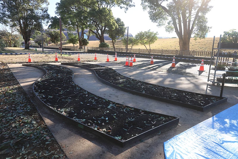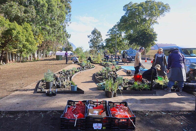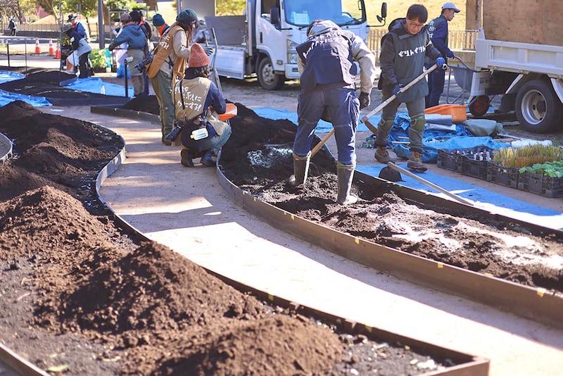 コンテストガーデンのエリアには、あらかじめ事務局によって、木枠で縁取られた1.2×10mの波打つ花壇が2対1組で設置されています。黒土をメインとした客土が施され、ガーデナーたちはそれをベースに、植栽計画に沿って土壌を整え、苗や球根を植え付けました。土壌改良や施肥の方法はデザイナーによって異なります。