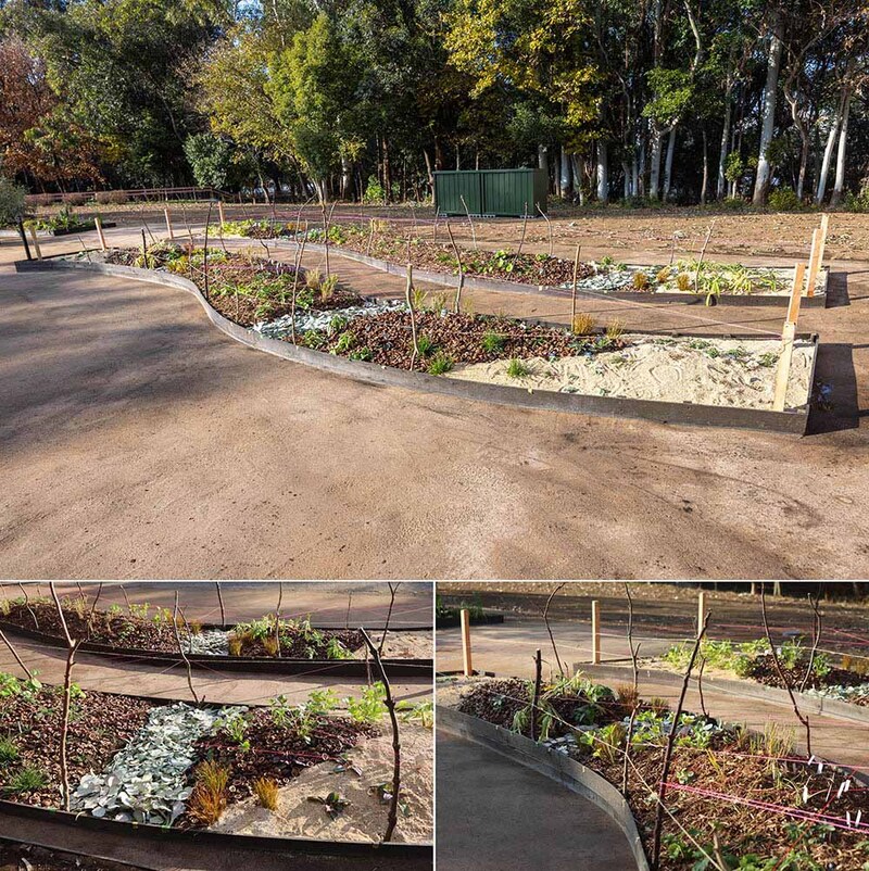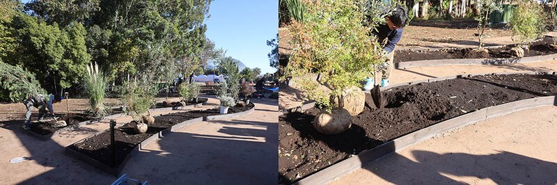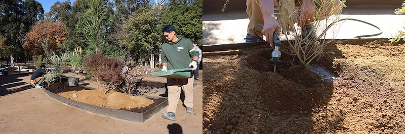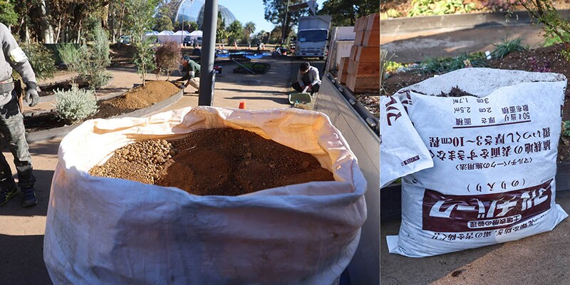 オージープランツが多いので栄養はそれほど必要ないと考え、もともとの土壌に発酵させた堆肥を加える程度に留めています。堆肥は籾殻や米糠、ピーナツの殻、ソバ殻を燻蒸で発酵させたものを用いました。ソバ殻の炭素分が多く、空気の層を作ることができるので、根の伸長を促してくれます。
