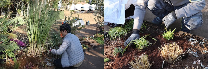 グラスの枯れ葉を除去(左)。/マルチバークで表土にマルチングをする(右)。