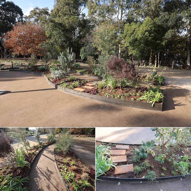 ガーデンの一部に溝をつくり、その両側に棒を2本渡してユーカリの葉を敷き詰める。また、その傍らにクルミの殻を敷き詰めるコーナーをつくる。