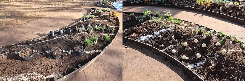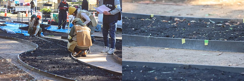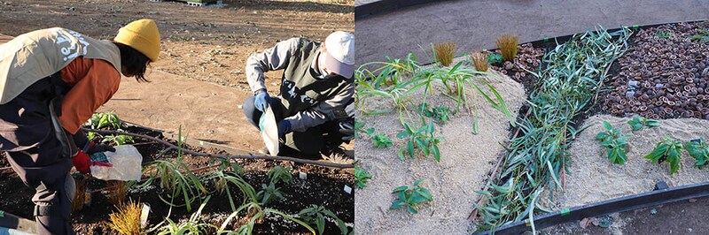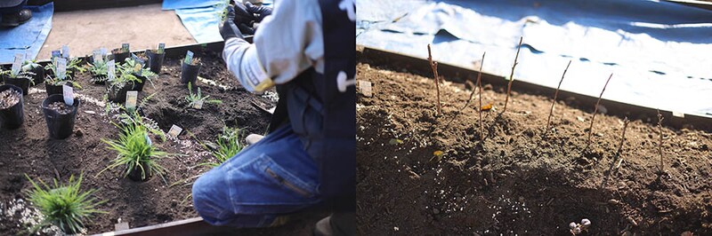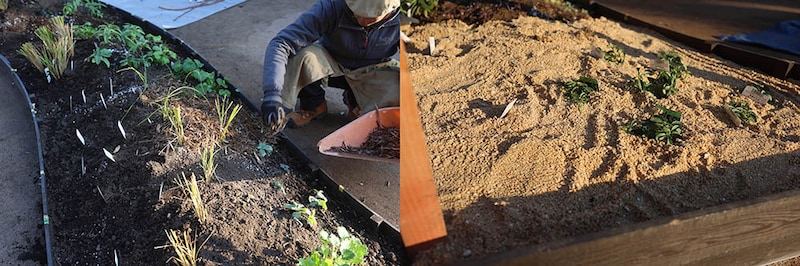 苗と球根を植え付ける(左)。/球根を植え付けた場所に棒切れで目印を立てる(右)。