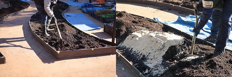 土壌を耕したあと、堆肥と米糠を加えて混ぜ耕す。