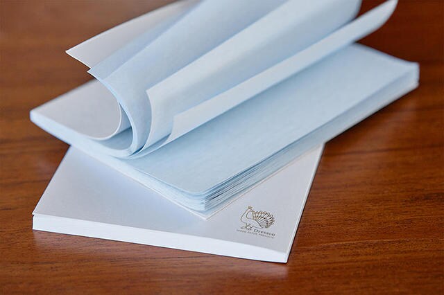「メモリフィル 無地」は、オニオンスキンペーパー2色とバンクペーパーのステーショナリーペーパー3種。玉ねぎの薄皮のように軽くやわらかく、しわ感のあるオニオンスキンペーパー「ケイトジョーオニオンスキン」はTAKEO PAPER PRODUCTSでしか味わえないオリジナルの用紙。ホワイトとペールブルーの2色展開。鉛筆やペン、万年筆と相性がよく、独特な書き味が魅力。「バンクペーパー」は、銀行の帳簿用紙として開発されたステーショナリーペーパー。滑らかでしっかりとした質感で、裏抜けに強く万年筆にも向いている。製紙メーカーの品質保証の証「THREE DIAMONDS」のウォーターマーク(透かし)が入っている。6㎜罫線と5㎜方眼入りの「メモリフィル 罫線/方眼入り」には、柔らかくあたたかい肌触りのファインペーパー「風光」を使用。さわやかな白さと心地よい書き心地が魅力。印刷線にはグレーの「星罫」を採用し、インクの乗りを妨げず、文字をくっきりと見やすくしている。