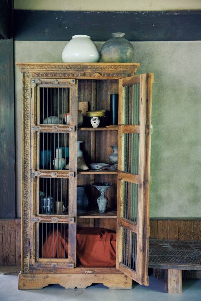 湿気をシャットアウトするため土間を打ち、土壁を壊して出た土は再び捏ねて新たな土壁に。庭をアートのように鑑賞する窓は、微調整を繰り返して位置を決めたという。窓の外に目をやれば、遠く向こうまで続く敷地にさまざまな植物の姿。自然にあるように見えて、すべて片桐さんが新たに植えたもので、シンボルツリーの枝垂れ桜をはじめ、樹木から草花まで150種ほどにのぼる。葉の落ちた桜の枝にメジロが残した巣を見つけ、この枝に桜が咲いたらどんなに素敵だろうと半年の月日を待ち、ようやく咲いたひと枝を生けたというエピソードからは、この家で過ごす豊かさが伝わってくる。そこに欠かせない、重要な役割を果たすものが美を兼ね備えた工芸品の数々だ。
