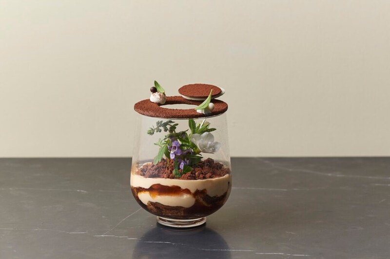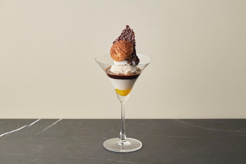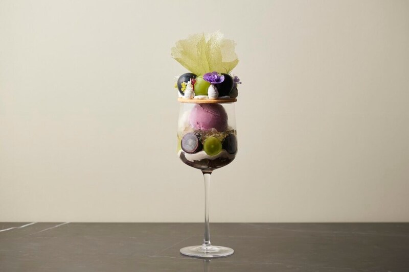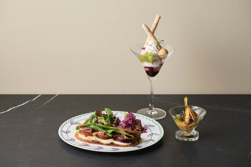 この食べるのがもったいないくらいの美しさを纏うパフェは、東京・銀座『GINZA SIX』内に9月5日にオープンしたばかりの『マルニ カフェ』のシグネチャーメニュー。東京を代表するパティスリー『パティスリィ アサコ イワヤナギ』が手がけ、〈マルニ〉が表現する色彩感覚を生かしたアーティスティックなデザートだ。今の季節は、シャインマスカットやブドウをメインに使い、クレームシャンティ、モンブランクリーム、栗はちみつブランマンジェを織り込み、レモンやライムスカッシュジュレで爽やかさをプラス。チュールのようにトップに飾られたミントの飴細工やレモン味のショートブレッドが食感を楽しませてくれる。その繊細さと一口ごとに訪れる驚きは、まさにプレイフルな1品。