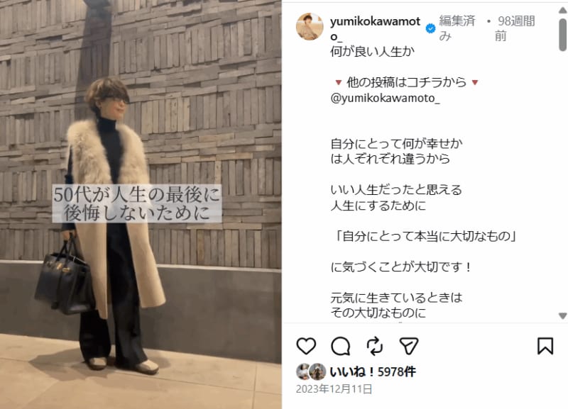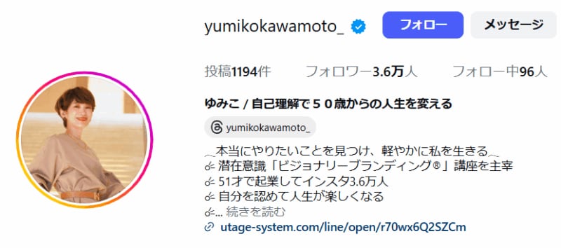 23年間の主婦業から一転、51歳で起業。後悔しない生き方を発信。講座を開いたり、SNSで情報を公開したり、大人世代から厚い支持を受けています。フォロワーは3.6万人(2026年1月時点)。