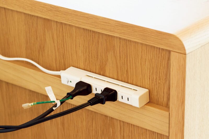 電源タップは両面テープなどでテレビ台の裏につけコードを浮かせます。