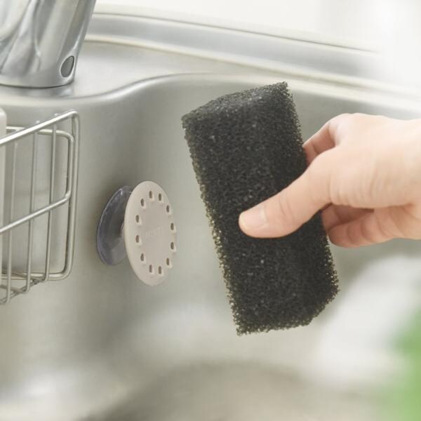 スポンジ収納の衛生面の悩みを解決してくれる、浮かせるスポンジホルダー。吸盤式のスポンジホルダーに、片手でポンッと置くだけ。スポンジが斜めになるので、水切れも◎。