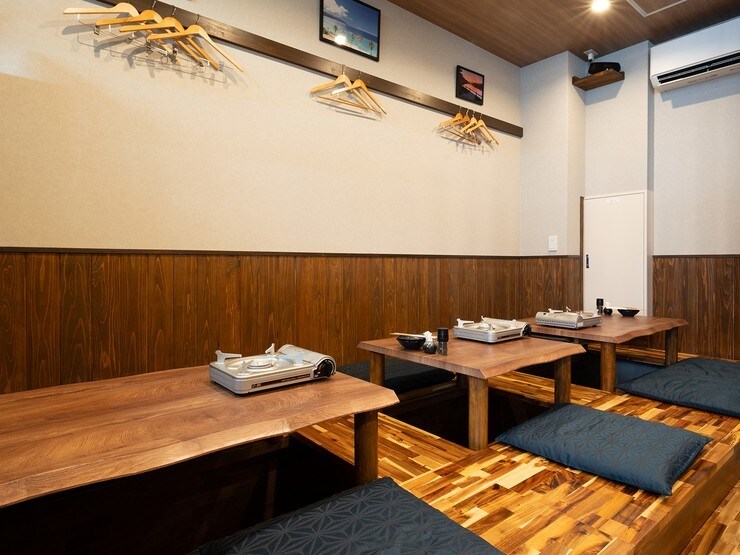 店内には、テーブル席のほか、一人でも気軽に利用できるカウンター席や子ども連れのファミリーでも過ごしやすい掘りごたつ式の座敷席を完備。各テーブルにはコンロが設置されていて、ラム肉を囲んで特別な時間が過ごせます。ドリンク類も豊富で日本全国の日本酒のほか、奄美大島の黒糖焼酎やワインも用意、多彩な味わいが楽しめます。