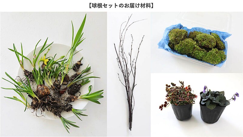 花材/球根花22球くらい(スノードロップ、原種チューリップ、クロッカス、ムスカリ、フリチラリア、スイセン、チオノドクサ、ミニアイリス、プシキニア、シラー、ヒアシンス等から旬のものを選んでお送りします)、花苗2株(ワイルドストロベリー、八重クローバー)、ハイゴケ1パック
