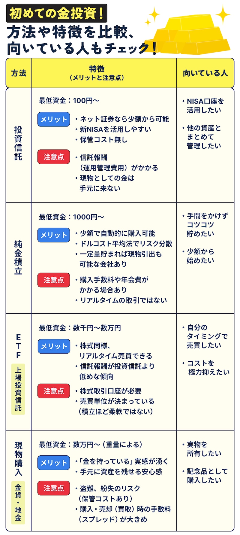 金投資には主に「投資信託」「積立」「ETF」「現物購入」の4つの方法があります。それぞれの特徴を整理しましたので、自分のスタイルに合った方法を選んでみましょう。