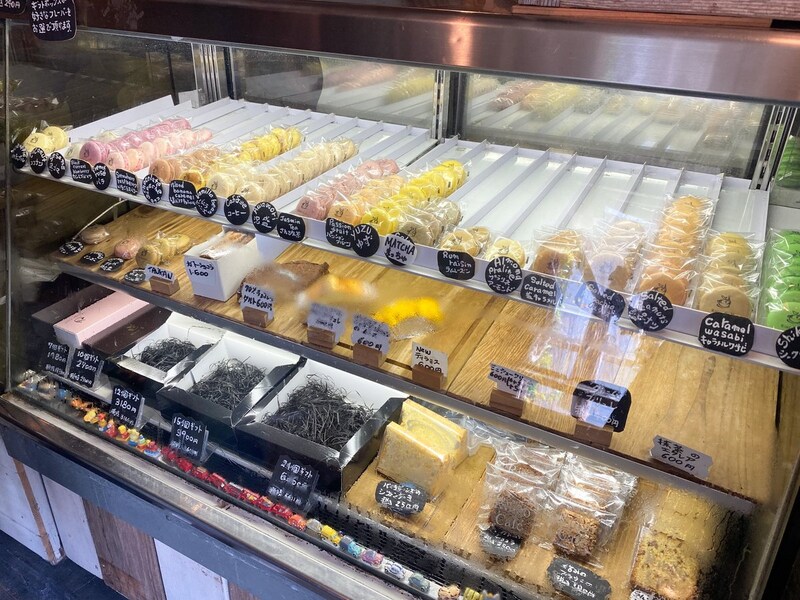 店頭に並ぶのは、20種類以上にも及ぶ色とりどりのマカロン。さんぴん茶や泡盛など、沖縄らしい素材を取り入れたフレーバーが揃い、ショーケースを眺めているだけで自然と心が弾みます。