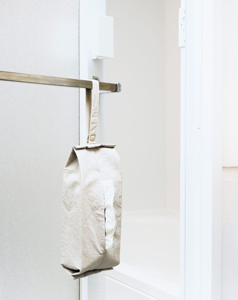 お風呂のドアにティッシュをぶら下げ、ごみ箱も近くに置いて。