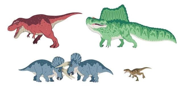 描かれている恐竜は、下記イラスト左からフクイラプトル、スピノサウルス、ティラノサウルス、トリケラトプスの4種。いずれも白亜紀(約1億4,500万年前から6,600万年前)に生息していた恐竜。